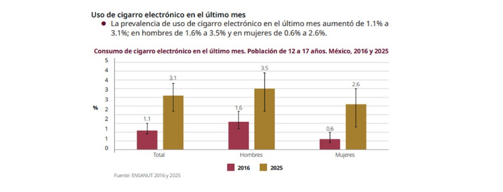 En adolescentes, el uso de vapeadores casi se triplicó, consolidándose como una nueva puerta de entrada al consumo de nicotina. Este incremento también se observa en mujeres, lo que representa un reto adicional para la salud pública, dada la percepción errónea de que el vapeo es menos dañino.